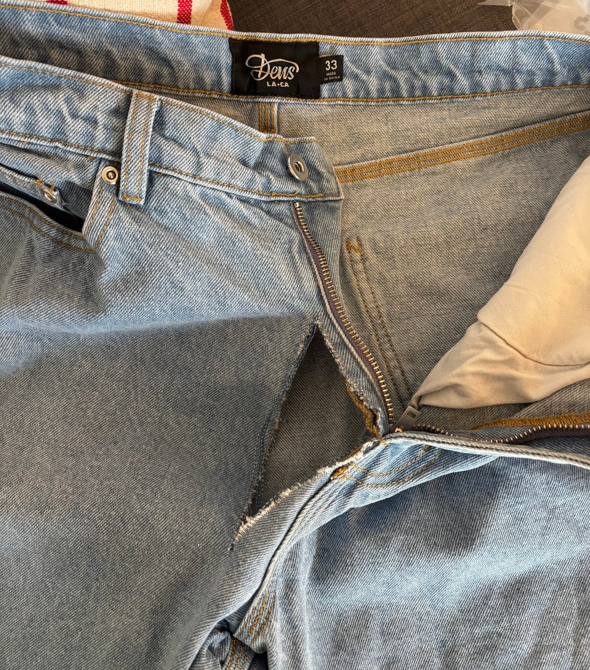 We repair the area by placing a patch underneath and stitching on the outside, carefully working around the metal zip. This reinforces the fabric and keeps the repair strong and durable while the patch inside ensures comfort while wearing.